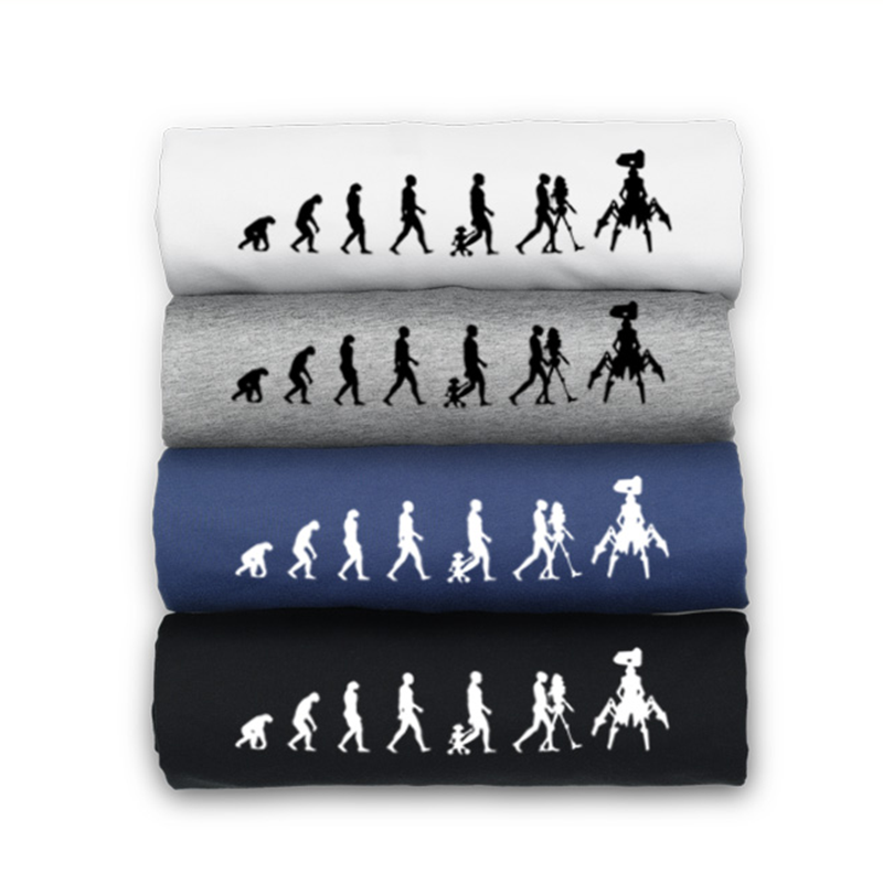 Embark on a journey through time with our "Evolutionary Journey" T-shirt. This captivating design traces the path from our primordial beginnings to a futuristic vision, making it a perfect blend of science and art. The sequence culminates in a whimsical twist with a robotic figure, suggesting an intriguing look at what the future of evolution might hold.