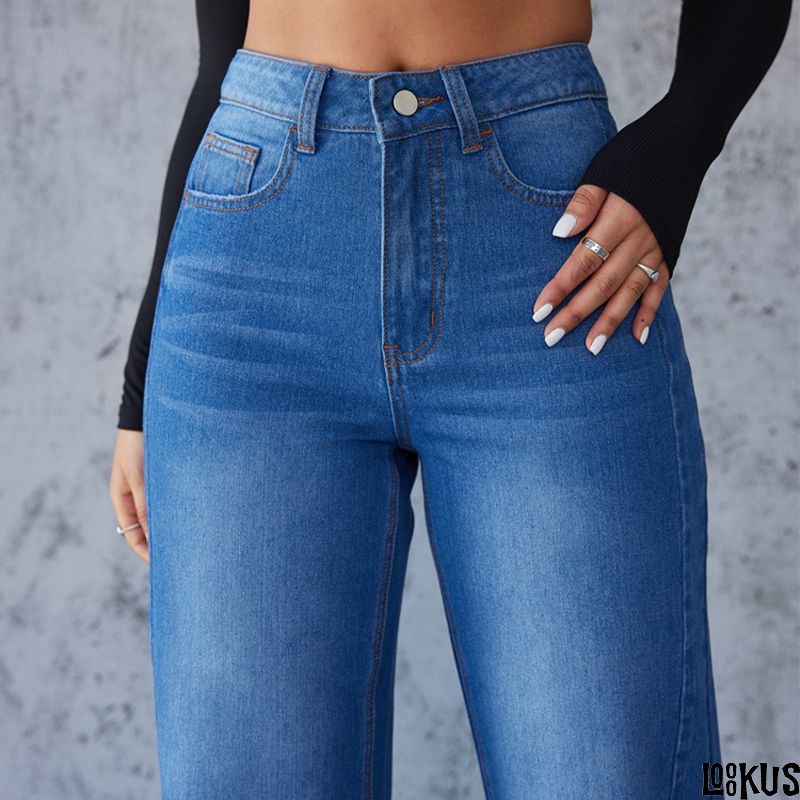 These jeans are crafted with high-quality polyester, providing durability and a soft feel against the skin. The high waist design offers a flattering fit that enhances your silhouette, while the straight leg cut ensures a classic and timeless look. With no stretch, these jeans maintain their shape and provide a structured fit.
